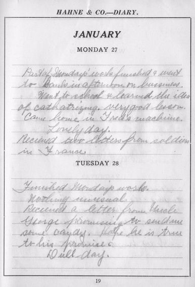Mon., 1/27 Part of Monday’s work finished and went to bank in afternoon on business. Went to school and learned the idea of catheterizing. Very good lesson. Came home in Fred’s machine. Lovely day. Received two letters from soldiers in France.