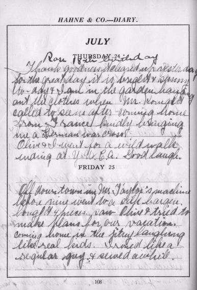 Thurs., 7/24 Rose 18th birthday. Thank goodness it cleared up yesterday for the great day. It is bright and sunny today and I am in the garden hanging out the clothes when Mrs. Knight called to see us after coming home from France, kindly bringing me a German war cross. Olive and I went for a wild walk ending at Y.W.C.A. Good laugh.