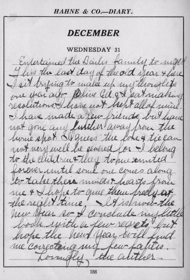 Wed., 12/31 Entertained the Bailis family tonight. This the last day of the old year and here I sit trying to make up my thoughts one year ago. Olive, Ed and I sat making resolutions. I have not kept all of mine. I have made a few friends but have not gone any further from the home spot. I guess the love and tie can not very well be severed. I belong to the children and they to me, united forever until someone comes along to take their minds and hearts from me and I hope to give them freely at the right time. It is now the New Year so I conclude my little book with a few regrets but hope the New Year will find me correcting my few faults. Lovingly, the author. (Emma Dickinson)