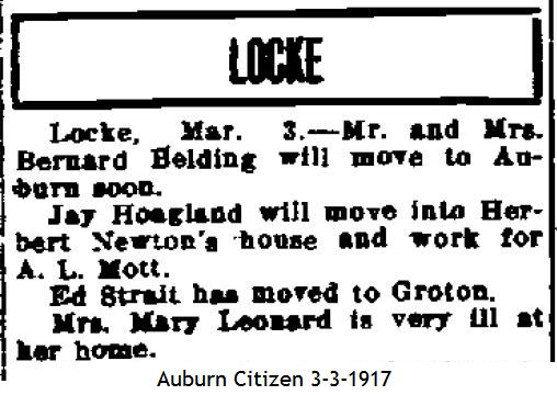 News clippings pertaining to Mary Leonard in Locke and Groton, possibly Mary "Polly" Brown Leonard who married Charles Russell Leonard. See the Leonard page or Leonard Road for more.