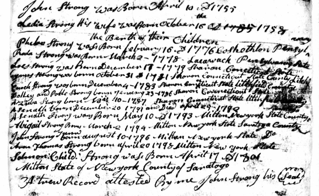 Rev. John Strong was my maternal 6th great-grandfather. He was born on the 10th of April, 1755, in Coventry, Tolland County, Connecticut. He was the son of Enoch Strong and Sarah (Meraugh) Strong. John married Lydia Thomas in Cochecton, New York, in March of 1775 and together they had fifteen known children.